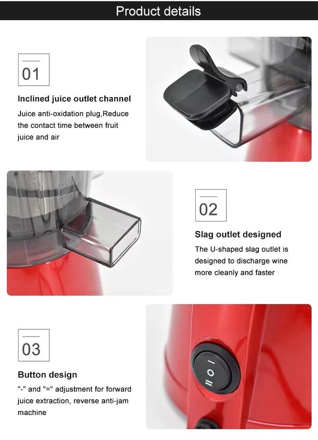 Function: Automatic Pulp Ejection, Dish Washer Safe, Non-Drip Spout, Reverse