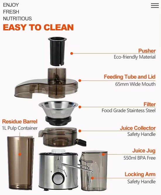 Function: Automatic Pulp Ejection, Dish Washer Safe, Non-Drip Spout, reverse function, LOW NOISE