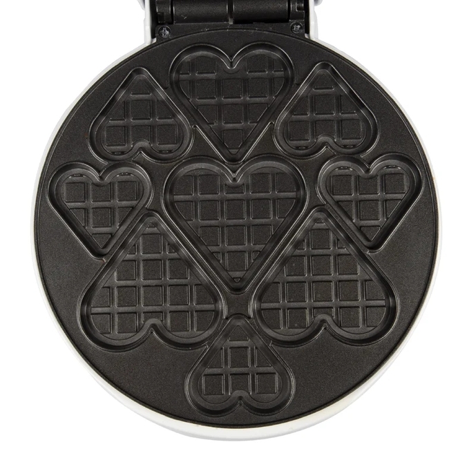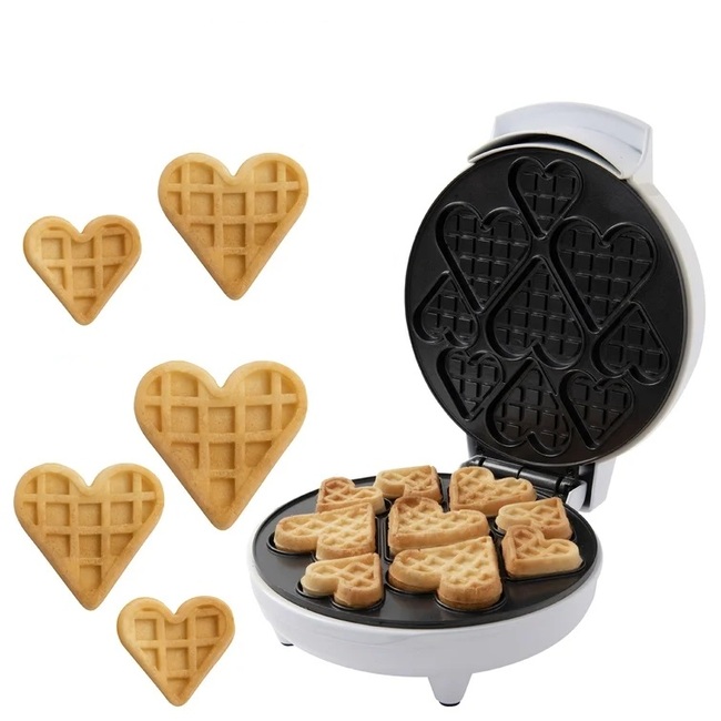 Feature: The Mini Heart Waffle Maker cooks 9 fun little heart-shaped waffles in minutes. The non-stick plate makes cooking a breeze and the indicator light lets you know when the waffles are baked to perfection.Nonstick coating for easy clean up. Wipe clean with a damp cloth. Not dishwasher safe.