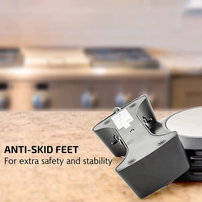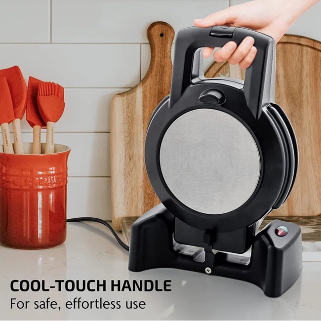 Features: This waffle iron has a 180° rotary function to ensure even cooking on top and bottom.1000 Watt heating system for efficient baking.The built-in thermostat avoids it from overheating, while the safety lock guarantees quick and convenient flipping without making a mess.Has non-slip feet to keep it in place, protecting your countertop from any spills.Has a compact size for easy storage in your cupboard or pantry, also it can stand upright.