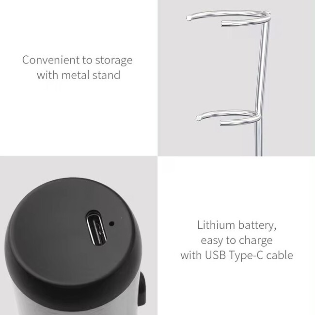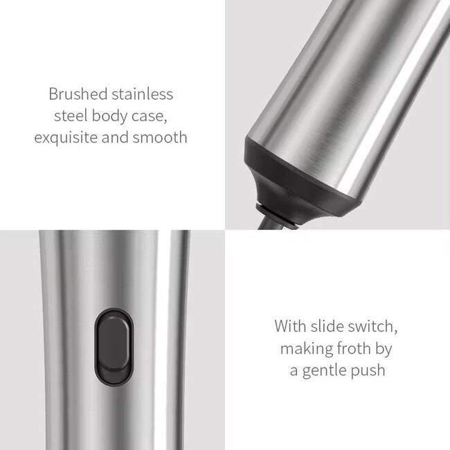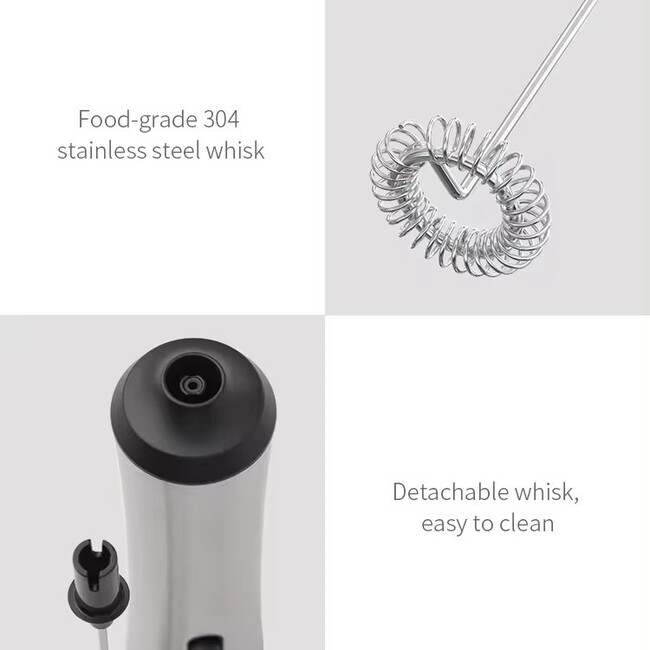 Feature: This milk frother has a friendly design, just press the button and start stirring immediately, a cup of milk foam comes out right away.304 stainless steel mixing head, food-grade safe material, with environmentally friendly and durable lithium battery, 500MAH capacity, good stability and long battery life.